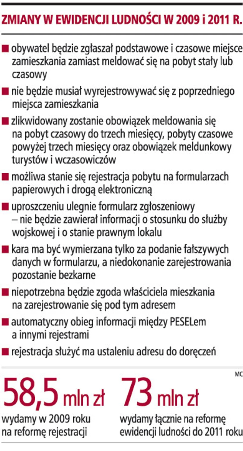 Przewiduje się, że już w II kwartale 2009 roku zostaną zlikwidowane obowiązki związane z meldowaniem się na pobyt czasowy do trzech miesięcy, pobyty czasowe powyżej trzech miesięcy, obowiązki meldunkowe wczasowiczów i turystów oraz zgłaszanie wymeldowywania. Będzie też uproszczony formularz zgłoszenia miejsca pobytu. Na przykład nie trzeba będzie dokumentować stanu prawnego lokalu oraz podawać w nim