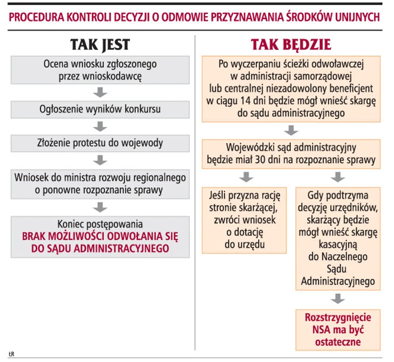 Po wyczerpaniu środków odwoławczych przewidzianych w systemie realizacji programu operacyjnego i po otrzymaniu informacji o negatywnym wyniku procedury odwoławczej wnioskodawca będzie mógł w tym zakresie wnieść skargę do wojewódzkiego sądu administracyjnego. Jest to nowość. Obecna procedura odwoławcza składa się tylko z dwóch etapów. Najpierw beneficjent odwołuje się do wojewody, a potem do Ministerstwa Rozwoju Regionalnego. Ustawa nie przewiduje odwołania do sądu. Dodatkowo obecny system kontroli wewnętrznej nie sprawdził się. W konsekwencji skuteczność odwołań jest niewielka.