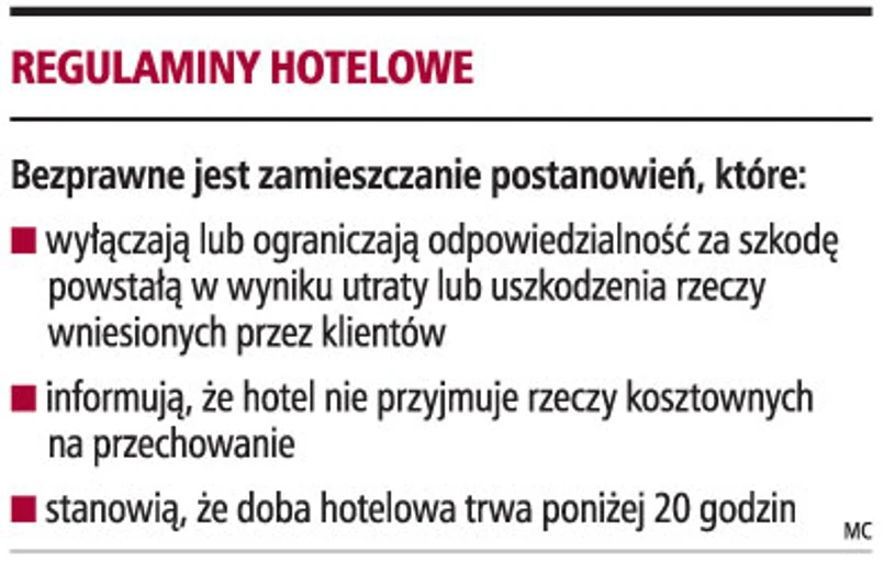 Ograniczanie odpowiedzialności za szkodę powstałą w wyniku utraty lub uszkodzenia rzeczy klientów, wyznaczanie czasu trwania doby hotelowej poniżej 20 godzin czy też nieprzyjmowanie kosztowności na bezpłatne przechowanie - to przykłady stosowanych w praktyce postanowień regulaminów hotelowych, które naruszają prawa konsumentów.
