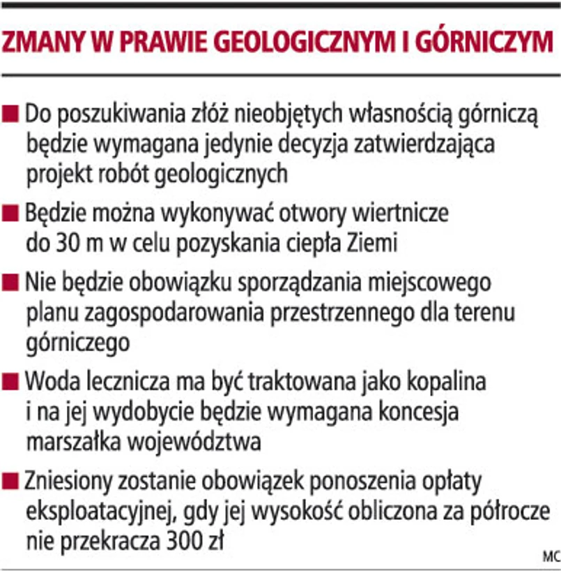 - Koncesje będą potrzebne jedynie do prowadzenia działalności w zakresie rozpoznawania i poszukiwania kopalin strategicznych (ropa, węgiel, rudy metali). Ma to być zachęta do tego, żeby ludzie mogli szybko i bez zbędnych formalności dowiedzieć się, co znajduje się pod ich ziemią i czy opłaca się to eksploatować - podkreśla wiceminister Henryk Jezierski.
