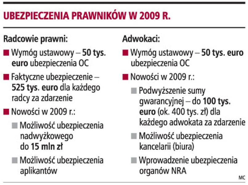 Od 1 stycznia 2009 r. wejdą w życie również zmiany w ubezpieczeniach adwokatów. Jak wyjaśnia Zenon Marciniak, wiceprezes Naczelnej Rady Adwokackiej, suma gwarancyjna ubezpieczenia podstawowego OC zostanie podwyższona do równowartości 100 tys. euro, czyli ok. 400 tys. zł. Co ważne, nie zmieni się wysokość składki. Dziś - jak tłumaczy Karolina Pióro-Chmielecka, adwokat z kancelarii prawnej Chałas i Wspólnicy - każdy adwokat posiada polisę na minimalną sumę gwarancyjną w wysokości 250 tys. zł.