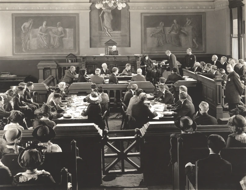 Okoliczność powyższa sprawiła, że instytucją ław przysięgłych zainteresował się przemysł filmowy. W roku 1955 pokazano w amerykańskiej telewizji przedstawienie teatralne zatytułowane „Dwunastu gniewnych ludzi”. Jego reżyserem był Reginald Rose (1920–2002). Ciepły odbiór wśród widzów sprowokował nakręcenie dwa lata później pełnometrażowego filmu o tym samym tytule. Tym razem reżyserem był Sidney Lumet (1924–2011). Obawy wytwórni w związku z tą produkcją były duże, dlatego film otrzymał niewysoki budżet. Jego akcja rozgrywa się więc jedynie w klaustrofobicznej salce, w której obraduje ława przysięgłych. Ponieważ każdy z sędziów winien oddać głos zgodnie z sumieniem, a werdykt dotyczący winy bądź niewinności oskarżonego musi być jednomyślny, atmosfera w i tak już dusznym pomieszczeniu niemal natychmiast jeszcze gęstnieje. Nieoczekiwanie dochodzi w nim do ujawnienia całej gamy ludzkich wad i uprzedzeń. Spotkanie, które w zamierzeniu miało potrwać zaledwie chwilę, w efekcie przeciąga się do rana, ale wyrok, który zapada, jest sprawiedliwy.