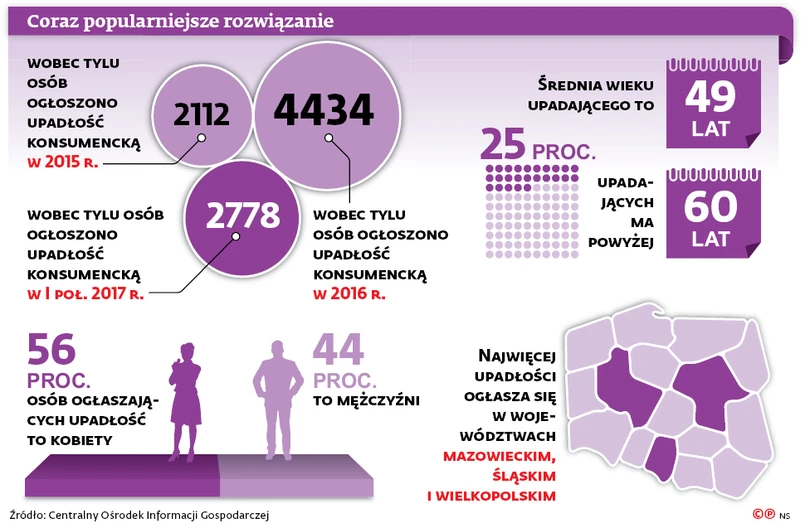 Przez lata upadłość konsumencka była w Polsce fikcją. Wymogi stawiane dłużnikom były takie, że niemal nikt ich nie spełniał. W 2014 r. postanowiono to zmienić. W efekcie od 31 grudnia 2014 r. obowiązują liberalne przepisy (Dz.U. z 2014 r. poz. 1306). Lawina oddłużeń ruszyła. W tym roku będzie ich ok. 5 tys. Eksperci przypuszczają, że za kilka lat ogłaszać upadłość będzie nawet 20 tys. osób rocznie. W tym ponad 5 tys. emerytów i rencistów, którzy u schyłku życia nie chcą mierzyć się z komornikami.