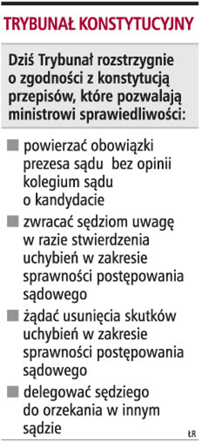 W prawie o ustroju sądów powszechnych znalazł się przepis, który pozwala ministrowi sprawiedliwości nie powoływać prezesa sądu, a jedynie powierzać określonemu kandydatowi pełnienie tej funkcji. Trybunał Konstytucyjny już raz wypowiedział się w kwestii odwoływania i powoływania prezesów sądów. Stwierdził wówczas, że ponieważ prezesi są organami władzy sądowniczej, powołuje ich i odwołuje minister sprawiedliwości. Jednak aby ingerencja władzy wykonawczej we władzę sądowniczą była zrównoważona, musi być poprzedzona wiążącą opinią przynajmniej takiego niezależnego organu jak Krajowa Rada Sądownictwa.