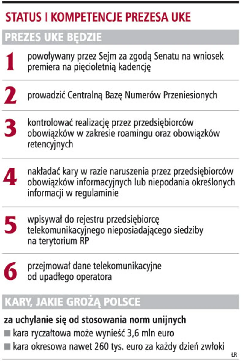 Prezes UKE będzie wybierany na pięcioletnią kadencję przez Sejm i Senat. Brak precyzyjnych przepisów umożliwi odwołanie prezesa UKE w każdej chwili. UKE skontroluje, czy przedsiębiorcy wykonują obowiązki w zakresie roamingu.