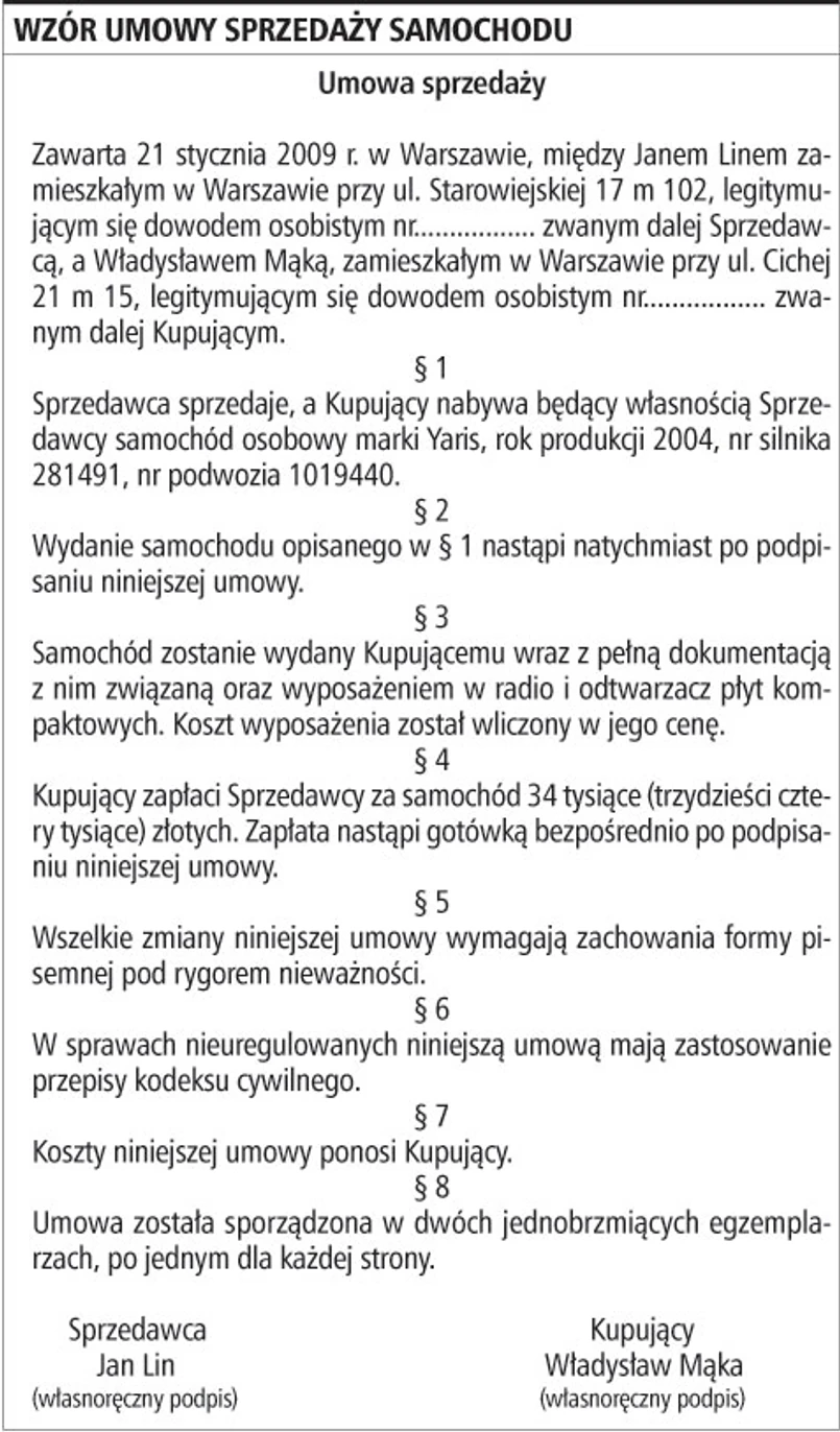 Umowę sprzedaży auta zawiera na piśmie dotychczasowy właściciel z nabywcą i zobowiązuje się w niej przenieść na kupującego własność pojazdu. Natomiast kupujący zobowiązuje się w umowie odebrać pojazd i zapłacić sprzedawcy cenę również wskazaną w umowie.