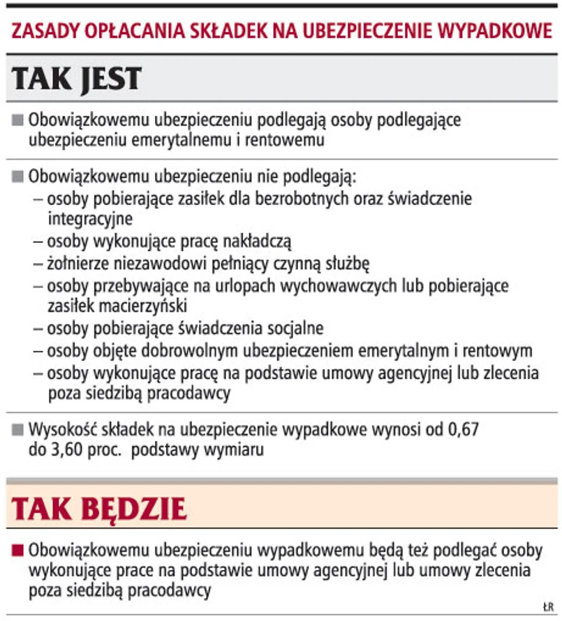 Ministerstwo Pracy i Polityki Społecznej skierowało pod obrady rządu projekt nowelizacji ustawy z 13 października 1998 r. o systemie ubezpieczeń społecznych (Dz.U. z 2007 r. nr 11, poz. 74 z późn. zm.). Zgodnie z nim, zleceniobiorcy wykonujący prace na podstawie umowy zlecenia poza siedzibą zleceniodawcy lub miejscem prowadzenia przez niego działalności będą obowiązkowo podlegać ubezpieczeniu wypadkowemu. Takie osoby, np. agenci ubezpieczeniowi, będą obowiązkowo objęci tym ubezpieczeniem.