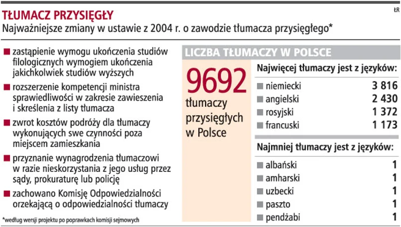 Obecny wymóg ukończenia studiów filologicznych lub podyplomowych studiów tłumaczeniowych ogranicza dostęp do zawodu tłumacza przysięgłego dla osób znających zarówno język obcy, jak i terminologię prawniczą, które nie posiadają odpowiedniego dyplomu - twierdzi Urszula Dzierżawska-Bukowska, prezes Stowarzyszenia Tłumaczy Polskich. Ograniczenie to jest szczególnie dotkliwe w odniesieniu do tzw. języków rzadkich. Bo w ich przypadku brakuje tłumaczeniowych studiów podyplomowych.