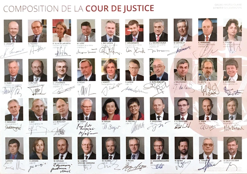 Na przełomie 2017 i 2018 odbywałem półroczny staż w gabinecie prof. Marka Safjana, polskiego sędziego w Trybunale Sprawiedliwości Unii Europejskiej w Luksemburgu. Pewnego deszczowego dnia (jak większość dni w tym państwie), patrząc na wiszący w moim pokoju plakat ze zdjęciami wszystkich członków trybunału – 28 sędziów (tyle, ile obecnie państw jest zrzeszonych w UE), 11 adwokatów/rzeczników generalnych i pierwszego urzędnika (le Greffier) – uznałem, iż fantastyczną i niepowtarzalną pamiątką ze stażu w trybunale byłby plakat podpisany przez wszystkich członków pod ich zdjęciami.