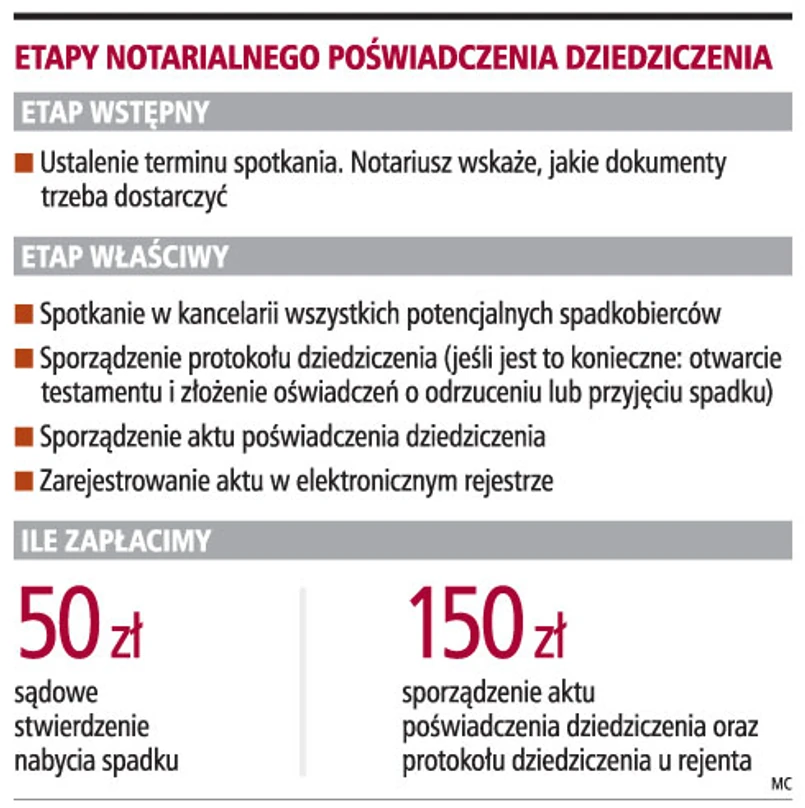W przypadku poświadczenia dziedziczenia stawka za czynności notarialne będzie wynosić około 150 zł. Stwierdzenie nabycia spadku w sądzie wymaga natomiast wniesienia opłaty w wysokości 50 zł.