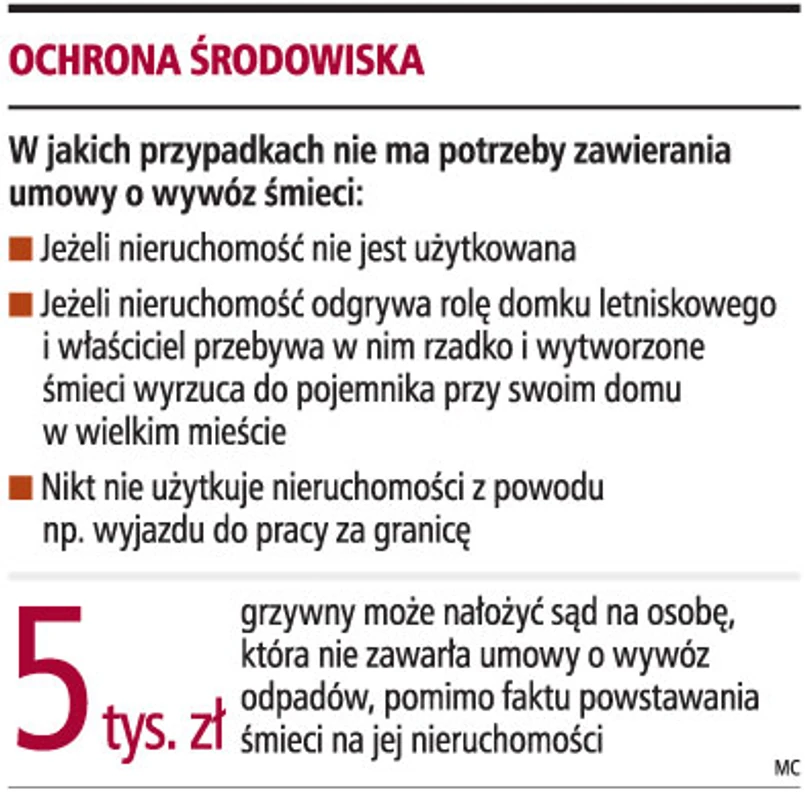 Jeżeli właściciel domu nie wytwarza odpadów, nie można zmuszać go do zawarcia umowy o wywóz śmieci. Opłaty powinny być pobierane tylko za okres, kiedy śmieci rzeczywiście są wywożone. Osoby, które oświadczą niezgodnie z prawdą, że nie wytwarzają odpadów, podlegają odpowiedzialności karnej.