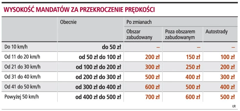 Projekt przewiduje, że w obszarze zabudowanym kierowca, który przekroczy dozwoloną prędkość o 10 km/h do 20 km/h, zapłaci 200 zł. Jednak jeżeli w takim miejscu kierowca będzie jechał o ponad 50 km/h szybciej, niż pozwalają znaki, to zapłaci 700 zł.