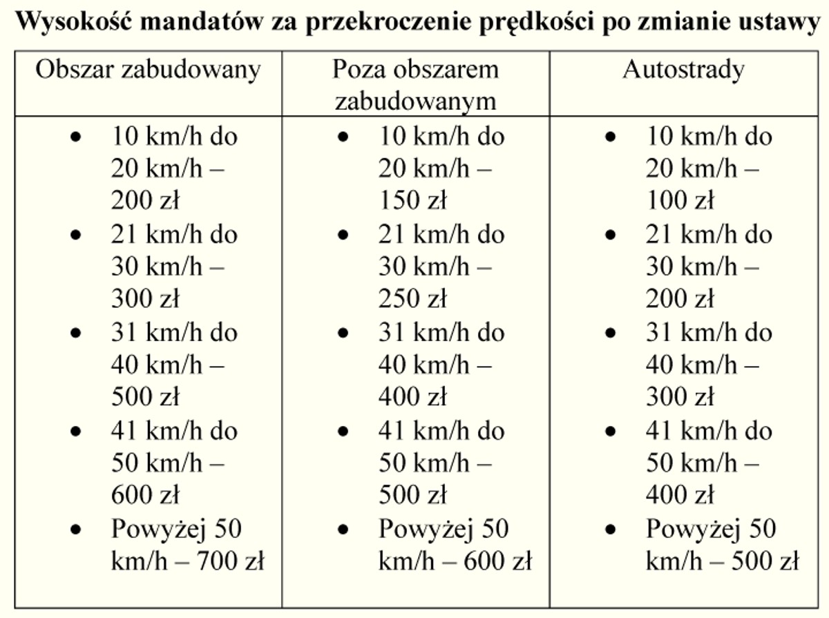 Poza obszarem zabudowanym przekroczenie dozwolonej prędkości o 10 km/h do 20 km/h będzie kosztowało 150 zł. Przy jeździe szybszej o ponad 50 km/h od dopuszczalnej prędkości kara wyniesie już 600 zł. Natomiast na autostradach i drogach ekspresowych kara wyniesie 100 zł jeżeli prędkość zostanie przekroczona o 10 km/h do 20 km/h. Z kolei 500 zł będzie groziło za jazdę na takich trasach z prędkością ponad 50 km/h od wskazanej w przepisach.