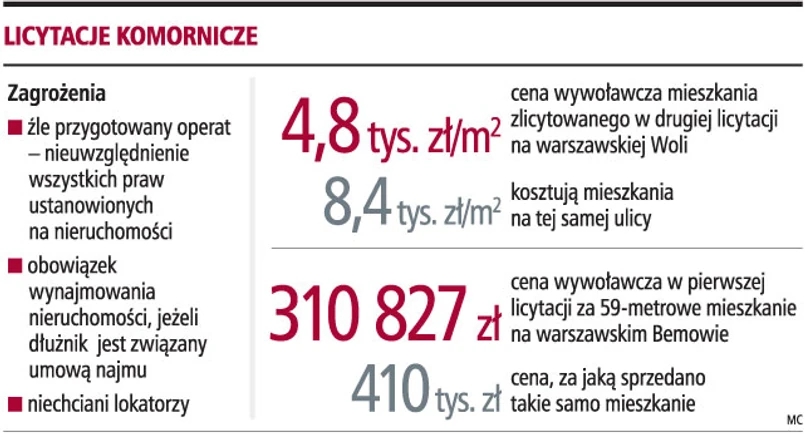 Cena wywoławcza na licytacji komorniczej znacznie odbiega od wartości lokalu. Licytant nabywa nieruchomość bez służebności i obciążenia na hipotece. Istnieje ryzyko, że nowy właściciel kupi mieszkanie z niechcianymi lokatorami.
