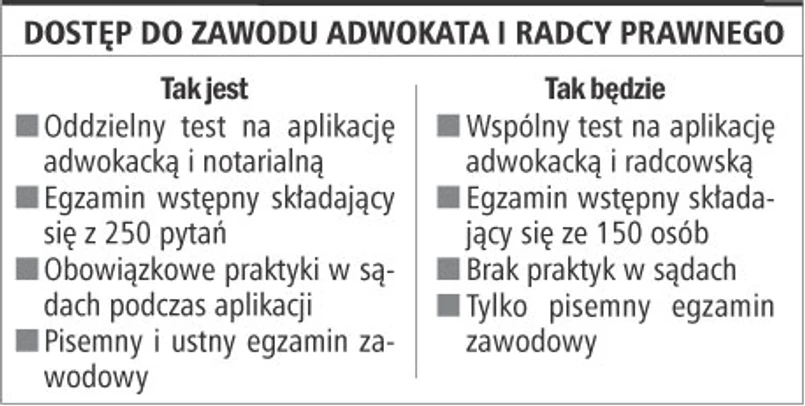 Wymóg odbycia aplikacji adwokackiej czy radcowskiej i złożenia egzaminu zawodowego nie będzie stosowany tradycyjnie do profesorów i doktorów habilitowanych nauk prawnych, jak również osób, które co najmniej trzy lata zajmowały stanowisko radcy lub starszego radcy w Prokuratorii Generalnej Skarbu Państwa. Bez problemów w szeregi palestry (radcostwa) wstąpić będą mogli sędziowie i prokuratorzy oraz odpowiednio radcowie prawni (adwokaci) i notariusze. W stosunku do tych osób zrezygnowano ze wskazania minimalnego okresu wykonywania określonego zawodu, jako koniecznej przesłanki wpisu na listę. Uprawnienia do wpisu uzyskają również osoby, które zdały egzamin sędziowski lub prokuratorski po 1 stycznia 1991 r., oraz doktorzy nauk prawnych, którzy w okresie pięciu lat przed złożeniem wniosku o wpis na listę adwokatów (radców prawnych) łącznie przez okres co najmniej trzech lat zajmowały stanowisko asesora sądowego, asesora prokuratorskiego, referendarza sądowego, starszego referendarza sądowego, aplikanta sądowego, aplikanta prokuratorskiego, aplikanta sądowo-prokuratorskiego, asystenta sędziego, asystenta prokuratora lub wykonywały wymagające wiedzy prawniczej czynności bezpośrednio związane ze świadczeniem pomocy prawnej przez adwokata lub radcę prawnego na podstawie umowy o pracę lub umowy cywilnoprawnej, np. w kancelarii adwokackiej, spółce cywilnej, jawnej, partnerskiej i komandytowej. Rozwiązanie to pozwala na uzyskanie wpisu na listę adwokata lub radcy prawnego osobom, które okres praktyki zawodowej odbywały na różnych stanowiskach, jak łącznie przez co najmniej trzy lata. Bez znaczenia dla wymaganego okresu jest forma wykonywania czynności. Jej podstawą może być zarówno umowa o pracę, ale również umowa cywilnoprawna, czyli np. umowa o dzieło czy zlecenie.
