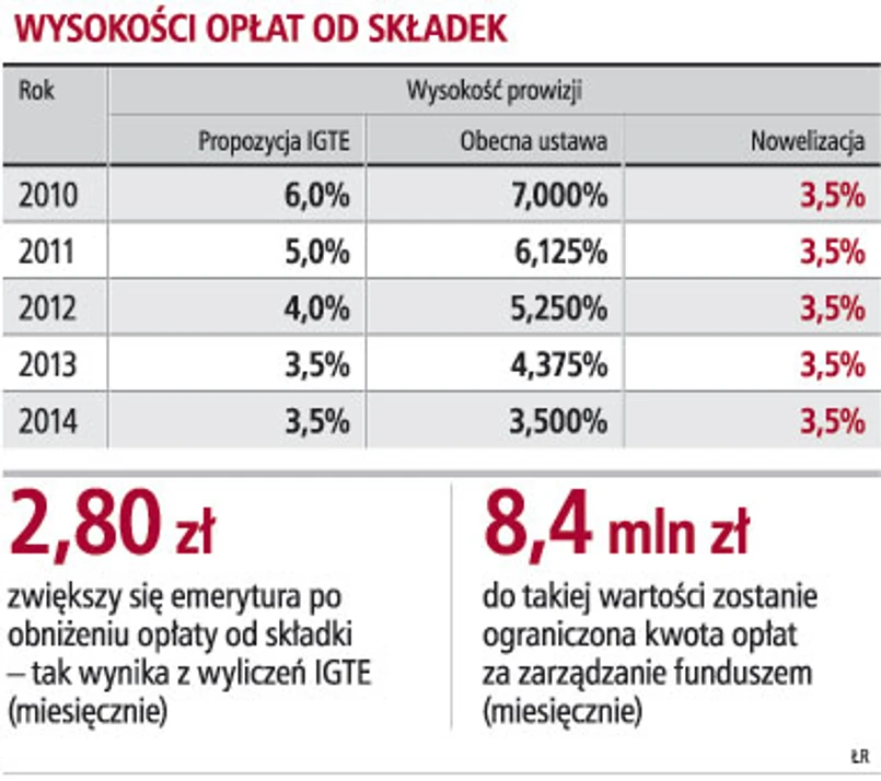 Po nowelizacji nastąpi obniżenie opłaty od składki, która nie będzie mogła przekraczać 3,5 proc. Dodatkowo zostanie ograniczony limit kwoty wynagrodzenia, jakie powszechne towarzystwa emerytalne (PTE) pobierają za zarządzanie OFE. Po nowelizacji wyniesie maksymalnie 8,4 mln zł miesięcznie. Próg ten ma obowiązywać już od roku 2009.