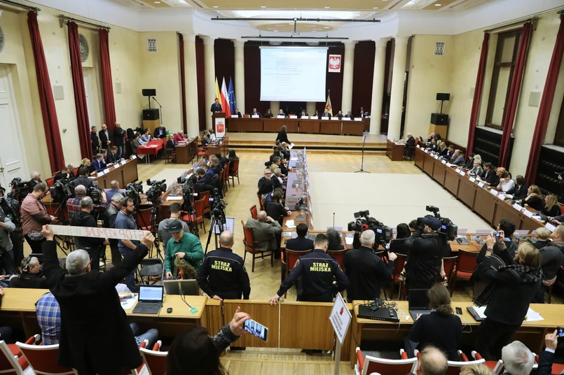 Po wystąpieniu Trzaskowskiego, szef klubu Koalicji Obywatelskiej Jarosław Szostakowski przedstawił wniosek o kontynuowanie obrad bez dyskusji. W odpowiedzi radni PiS zaczęli skandować: "Demokracja, demokracja, demokracja". Przewodnicząca rady miasta Ewa Malinowska-Grupińska (KO) powiedziała, że taki wniosek musi być poddany pod debatę.