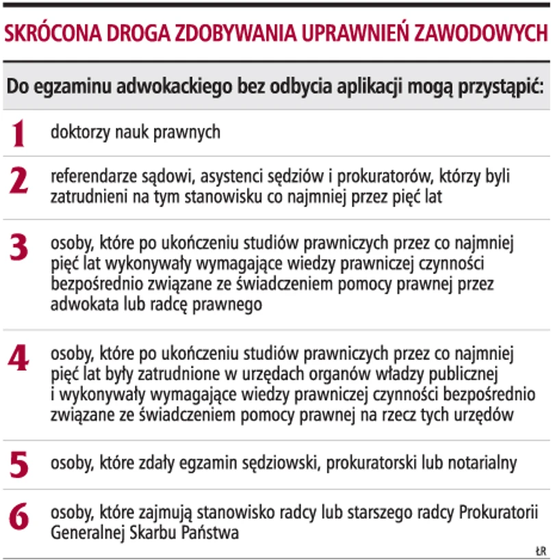Już od dziś doktorzy nauk prawnych oraz aplikanci sędziowscy i prokuratorscy, bez odbycia dodatkowego szkolenia i egzaminów, będą mogli wpisywać się na listę adwokatów i radców prawnych. Prawo takie przyznaje im wchodząca 25 marca w życie nowelizacja ustawy - Prawo o adwokaturze, ustawy o radcach prawnych oraz ustawy - Prawo o notariacie. Osoby te będą musiały jednak wykazać się co najmniej trzyletnim doświadczeniem zawodowym w zakresie stosowania prawa (w przypadku aplikantów wystarczy odbycie aplikacji etatowej). Dodatkowym wymogiem dla osób, które kształciły się do zawodu sędziego i prokuratora, jest zdanie egzaminu prokuratorskiego lub sędziowskiego. Nie wszyscy są jednak zadowoleni z takiego rozszerzenia dostępu do zawodów prawniczych.