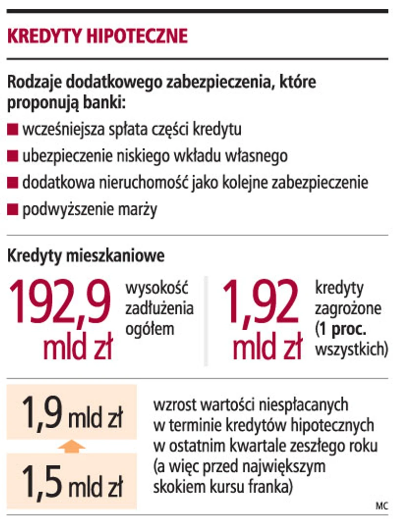 nieruchomości, coraz częściej żądają dodatkowych zabezpieczeń. Wszystko przez spadającą wartość nieruchomości, które nie stanowią już wystarczającego zabezpieczenia spłaty wysokiego kredytu. Spać spokojnie nie mogą również klienci banków, których kredyty we frankach tak zdrożały, że obecnie winni są bankom więcej niż warta jest ich nieruchomość. Także obniżenie zdolności kredytowej może łączyć się z żądaniami udzielenia dodatkowego zabezpieczenia czy zmiany warunków umowy. Komisja Nadzoru Finansowego uważa jednak, że spadek zabezpieczenia nie oznacza spadku zdolności kredytowej klienta, a działania podejmowane wobec kredytobiorców muszą uwzględniać ich specyfikę.