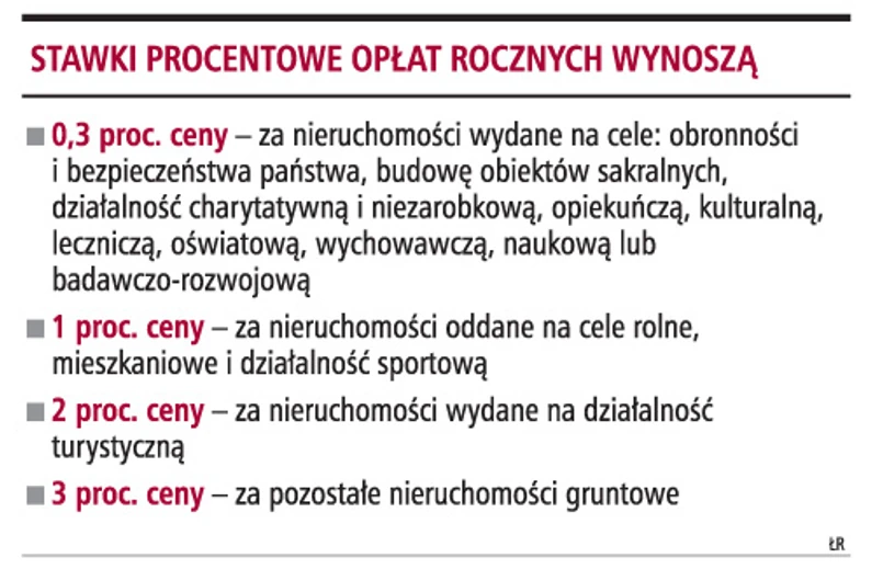 Wysokość opłaty rocznej wynosi od 0,3 proc. do 3 proc. ceny nieruchomości i zależy od wskazanego w umowie celu, na jaki została oddana w użytkowanie.