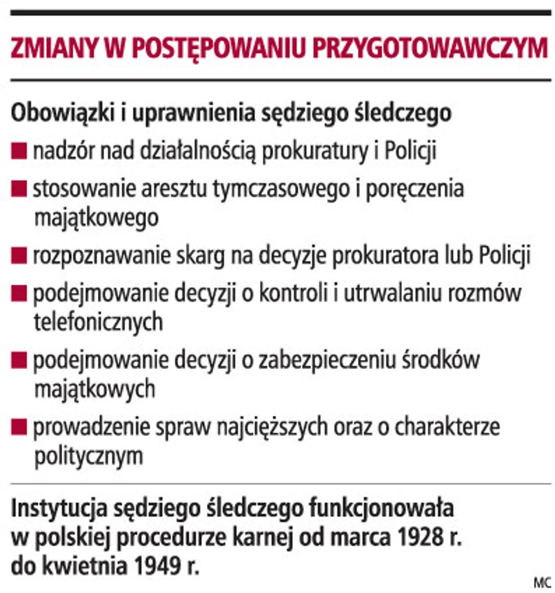 prawników pod kierunkiem prof. Piotra Kruszyńskiego z Uniwersytetu Warszawskiego. Wprowadzenie sędziego śledczego popiera Platforma Obywatelska i resort sprawiedliwości. Zdaniem Zbigniewa Chlebowskiego, szefa klubu parlamentarnego PO, projekt ustawy ma być gotowy do 15 lipca.