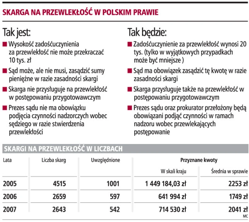 Minister Zbigniew Cwiąkalski wypowiedział wojnę przewlekłości postępowań w wymiarze sprawiedliwości. Ministerstwo Sprawiedliwości (MS) skierowało do uzgodnień międzyresortowych projekt nowelizacji ustawy o tzw. skardze na przewlekłość postępowania, który radykalnie zaostrza sankcje finansowe. Projekt zakłada, że sąd obligatoryjnie zasądzi na rzecz skarżącego kwotę 20 tys. złotych, gdy okaże się, że sprawa rzeczywiście nie została rozpoznana w rozsądnym terminie. Tylko wyjątkowo sąd będzie mógł ją obniżyć, ale nie mniej niż do 2 tys. zł. Obecnie może zasądzić kwoty do 10 tys. zł (nie jest to obowiązek), choć czasami są to kwoty symboliczne rzędu 100-200 zł. Odszkodowanie byłoby zasądzane od Skarbu Państwa lub od komornika, w razie uwzględnienia skargi na przewlekłość jego postępowania. Projekt wprowadza ponadto możliwość skargi na czynności prokuratora, który prowadzi albo nadzoruje postępowanie przygotowawcze. Ministerstwo szacuje, że rocznie z budżetu będzie potrzebne dodatkowo ok. 39 mln zł. Zmiana przepisów ma jednak na celu podniesienie skuteczności skargi i dostosowanie do standardów europejskich.