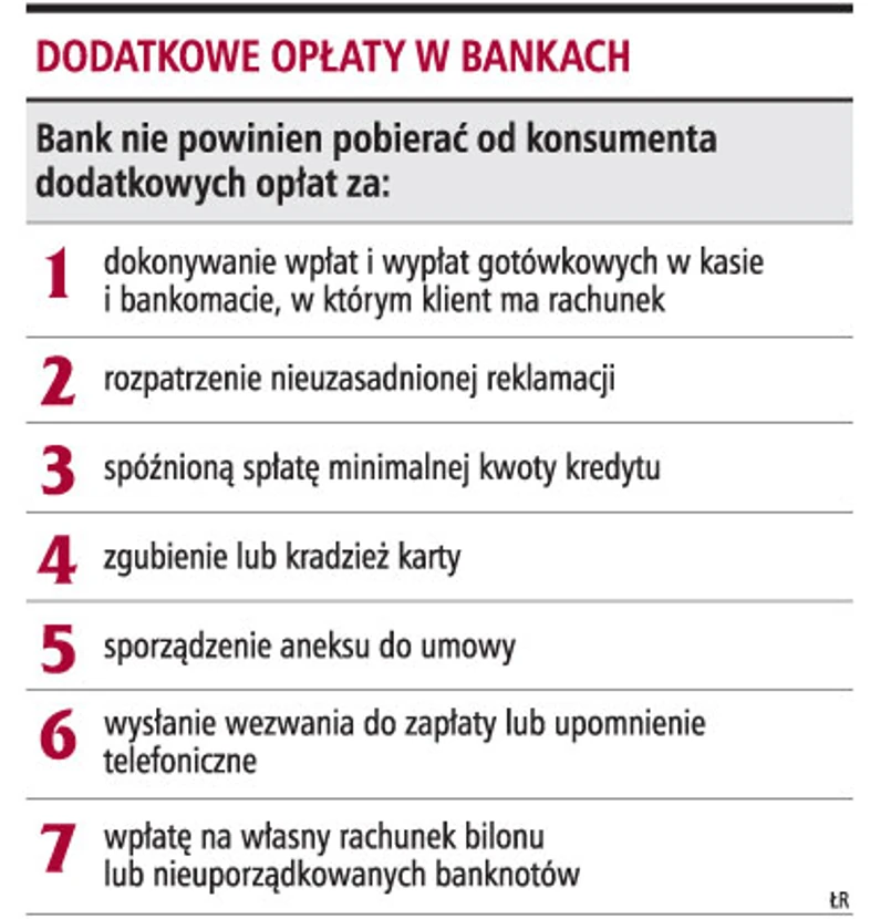 Niedopuszczalne jest naliczanie opłaty za nieterminową spłatę minimalnej kwoty kredytu. Banki nie mogą pobierać dodatkowych pieniędzy za czynności wykonywane w ramach jednej usługi. Na obciążanie konsumenta kosztami rozpatrzenia nieuzasadnionej reklamacji nie pozwalają przepisy.