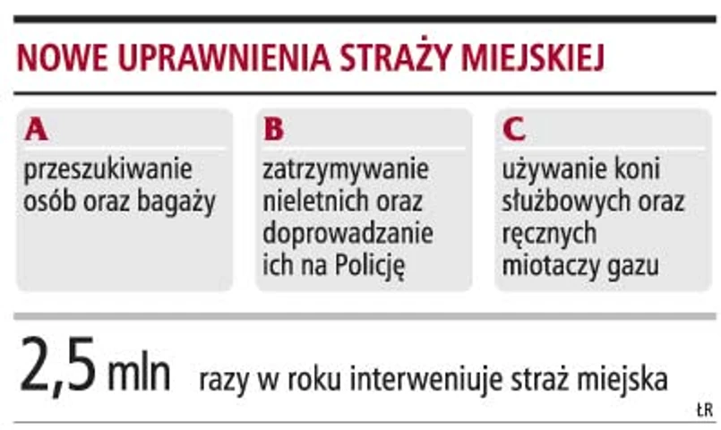 Strażnicy miejscy uzyskają prawo zatrzymywania nieletnich i niezwłocznego doprowadzania ich do najbliższej jednostki Policji. Projekt przewiduje też przyznanie strażnikom dwóch dodatkowych środków przymusu bezpośredniego - koni służbowych i ręcznych miotaczy gazu.