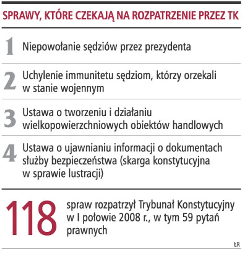 W tym roku Trybunał nadrobił już niektóre zaległości. Rozpatrzył bowiem przez pierwsze sześć miesięcy 118 spraw, w tym 59 pytań prawnych zadanych przez sądy w sprawie zgodności aktu normatywnego z konstytucją, 17 wniosków o stwierdzenie zgodności ustaw lub ratyfikowanych umów międzynarodowych z konstytucją, 35 skarg obywateli, siedem wniosków rzecznika praw obywatelskich, jedną sprawę kompetencyjną.