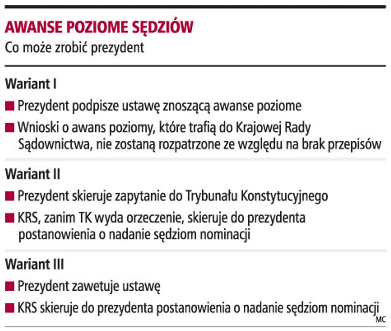 - Złożenie przez sędziego wniosku o awans poziomy rozpoczyna procedurę, która nie zakończy się w ciągu najbliższych kilku dni. Może być tak, że za 2 lub 3 dni prezydent podpisze ustawę i w związku z tym awanse poziome zostaną zniesione - zastanawia się sędzia Marek Celej, dyrektor biura prawnego KRS.