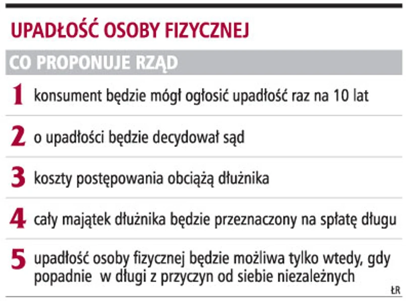 Konsument będzie mógł wystąpić z wnioskiem do sądu o ogłoszenie swojej upadłości. Stanie się to możliwe, gdy zadłużenie konsumenta powstanie z przyczyn niezależnych od niego. Koszty postępowania sądowego mają być finansowane z pieniędzy dłużnika.
