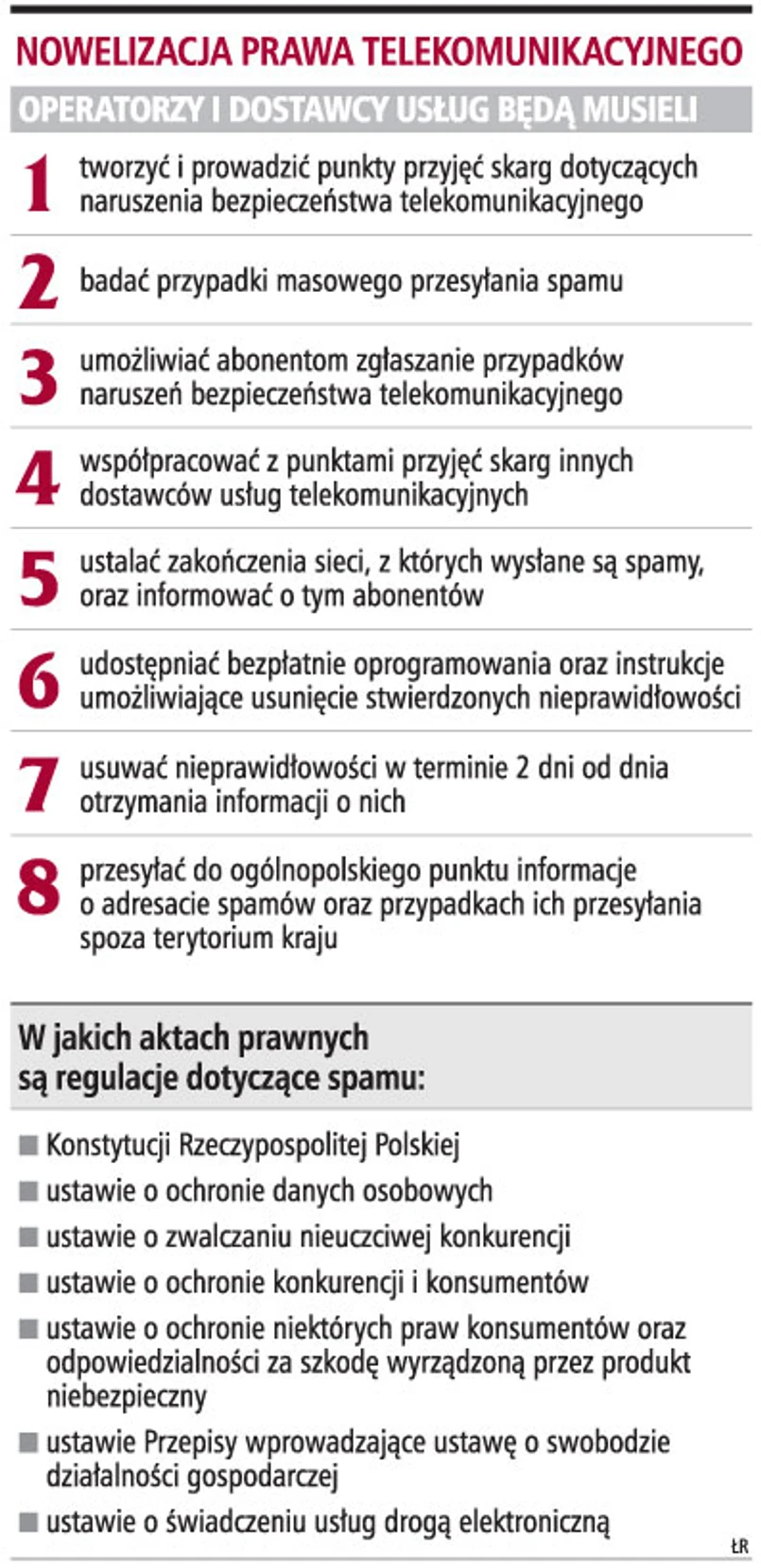 Jeżeli nowelizacja prawa telekomunikacyjnego zostanie przyjęta, zostaną nałożone nowe obowiązki operatorów i dostawców usług. Będę oni zobowiązani do wskazywania punktów przyjęć zgłoszeń o naruszeniach bezpieczeństwa telekomunikacyjnego, w szczególności przesyłania spamów, w ramach oferowanych usług. Nowością jest to, że dostawcy usług i operatorzy będą mogli podjąć bardziej zdecydowane i skuteczniejsze działania przeciwko nadawcom spamów, w tym blokować ruch w sieci. Autorzy projektu chcą także, aby użytkownicy, których urządzenia końcowe mogły zostać wykorzystane bez ich wiedzy i zgody do rozsyłania spamów, otrzymają niezbędne wskazówki, jak zabezpieczyć się przed podobnymi przypadkami.