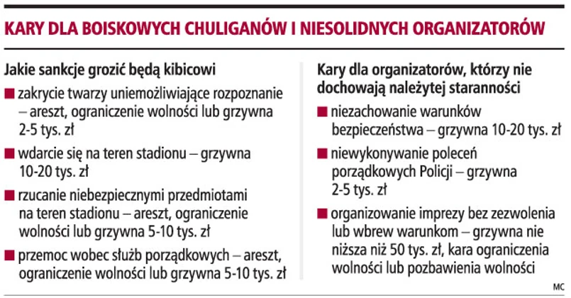 Zaostrzone zostaną kary dla chuliganów. Dodatkowo organizator meczu piłki nożnej będzie mógł nakładać na pseudokibica zakaz klubowy, czyli zakaz uczestnictwa w imprezach na okres do dwóch lat.