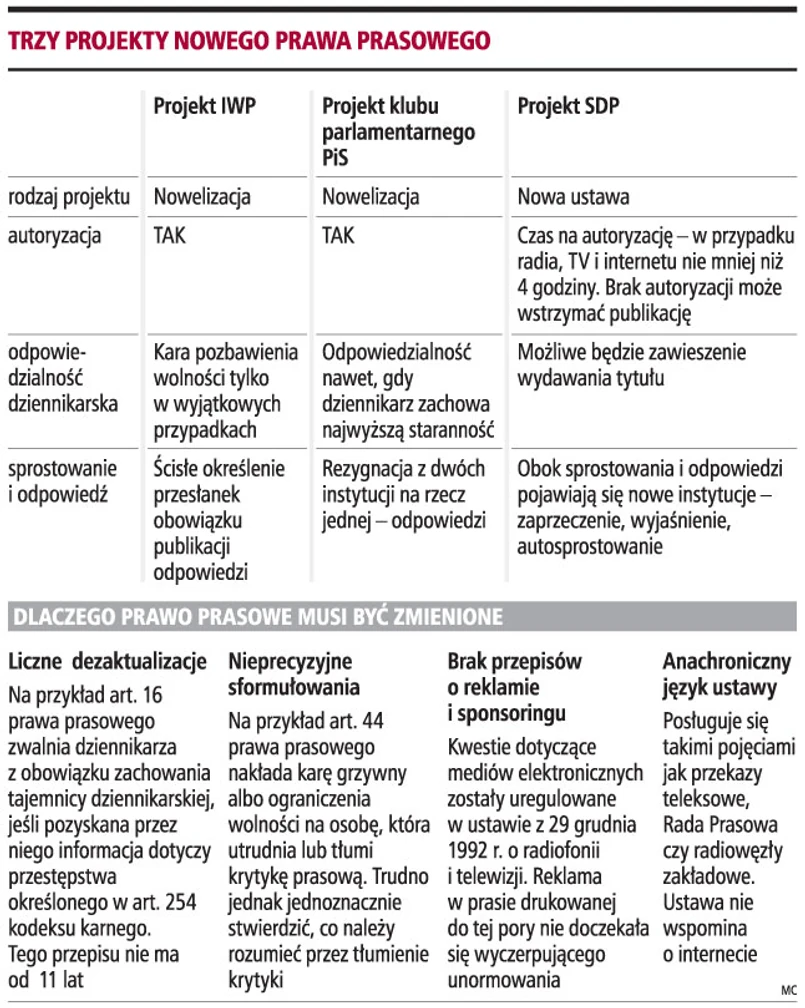 W Ministerstwie Kultury i Dziedzictwa Narodowego rozpoczęły się prace nad nowym prawem prasowym. Obecnie obowiązuje ustawa z 26 stycznia 1984 r. Prawo prasowe (Dz.U. nr 5, poz. 24 z późn. zm.). Podstawą do dyskusji są trzy projekty ustaw przygotowane przez: Stowarzyszenie Dziennikarzy Polskich, Izbę Wydawców Prasy oraz posłów z Klubu Parlamentarnego PiS.