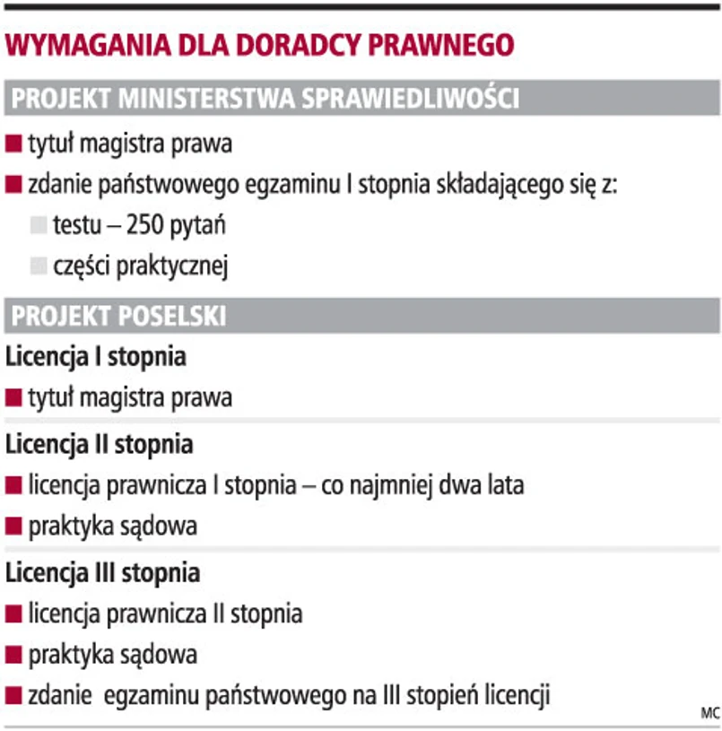 Jego zdaniem projekt ustawy o licencjach prawniczych przewiduje przyznanie tytułu doradcy prawnego jedynie po spełnieniu przesłanek formalnych. Resort Sprawiedliwości chce natomiast, aby kandydat na doradcę prawnego zdał najpierw egzamin państwowy, który ma sprawdzić jego merytoryczne przygotowanie.
