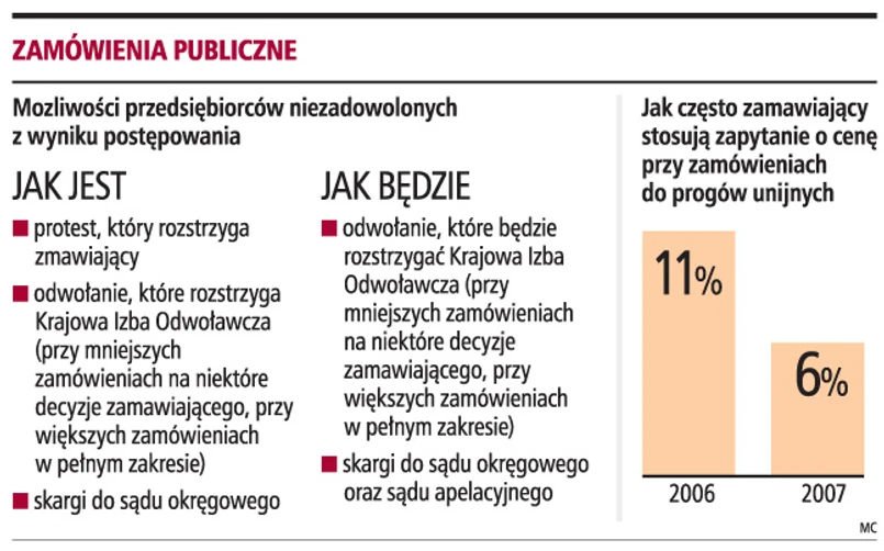 Krajowa Izba Odwoławcza, która rozstrzyga spory z zakresu zamówień publicznych, będzie miała prawo orzekać o unieważnieniu lub skróceniu umowy o zamówienie publiczne. Uzyska też prawo nakładania kar finansowych na zamawiających. Z systemu zamówień zniknie jeden z trybów - zapytanie o cenę. Takie zmiany zawiera projekt nowelizacji prawa zamówień publicznych skierowany już do uzgodnień międzyresortowych. Celem nowelizacji jest wprowadzenie do polskich przepisów rozwiązań zawartych w Dyrektywie 2007/66IWE Parlamentu Europejskiego i Rady z 11 grudnia 2007 r. Termin ich wdrożenia upływa 20 grudnia 2009 r.