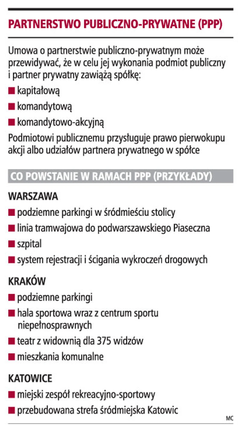 - Jednak rozwój partnerstwa publiczno-prywatnego w Polsce jest nieunikniony, nawet gdyby nie było żadnej ustawy. Głównym powodem jest faktyczny brak środków publicznych i coraz większe trudności ich pozyskania w tradycyjnej formie (kredyt, emisje obligacji) w porównaniu z ogromnymi potrzebami inwestycyjnymi. Związane są one chociażby z Euro 2012 czy realizacją projektów współfinansowanych środkami unijnymi - uważa Danuta Kamińska. Jej zdaniem, należy tylko samorządom pozwolić na działanie i nie przeszkadzać.