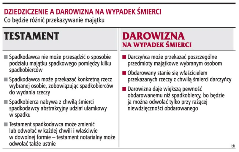 - Istnieje zasadnicza różnica pomiędzy darowizną na wypadek śmierci a testamentem. Darowizna daje większą pewność obdarowanemu niż spadkobiercy. Testament spadkodawca może zmienić lub odwołać w każdej chwili i właściwie w dowolnej formie - testament notarialny może odwołać także ustnie. Natomiast odwołanie darowizny będzie praktycznie ograniczone do rażącej niewdzięczności obdarowanego - wskazuje Patrick Radzimierski, radca prawny w kancelarii Salans.
