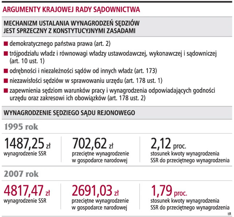 Krajowa Rada Sądownictwa skierowała do Trybunału Konstytucyjnego wniosek w sprawie zbadania zgodności z ustawą zasadniczą przepisów płacowych sędziów. Rada uważa, że Prawo o ustroju sądów powszechnych w zakresie stanowiącym podstawę prawną mechanizmu ustalania wynagrodzeń sędziowskich jest sprzeczne z konstytucją. W wyniku wad tego systemu płace sędziów ulegają systematycznemu zmniejszaniu.