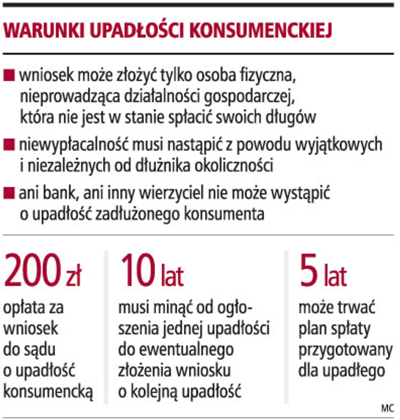 O ogłoszenie upadłości konsumenckiej może wystąpić dłużnik, który jest osobą fizyczną, nie prowadzi działalności gospodarczej i stał się niewypłacalny. Niewypłacalnym staje się wówczas, gdy nie płaci się swoich wymagalnych zobowiązań. Chodzi tu o takie przypadki, gdy dłużnik w terminie określonym umową lub ustawą nie zapłacił drugiego z kolei zobowiązania. Nie ma żadnego znaczenia, jak duże są to zobowiązania, a także, jak długo dłużnik zwlekał z ich uregulowaniem.