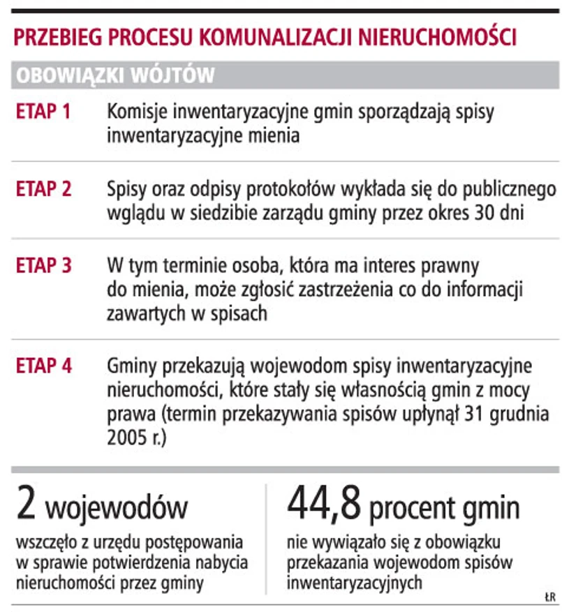 Informacje o stanie mienia komunalnego są wciąż niekompletne. Brak precyzyjnych przepisów doprowadził do rozbieżności między stanem rzeczywistym a danymi w gminnych ewidencjach nieruchomości oraz geodezyjnych ewidencjach gruntów i budynków. Do dziś nie został zakończony proces komunalizacji nieruchomości gminnych. Jak wynika z raportu Najwyższej Izby Kontroli, prawie 45 proc. skontrolowanych gmin nie przekazało wojewodom na czas spisów inwentaryzacyjnych nieruchomości, które z mocy prawa stały się własnością gminy. Teraz wojewodowie powinni wszczynać z urzędu postępowania w sprawie potwierdzenia nabycia przez gminy własności nieruchomości. Nie robią tego jednak, uważając, że to gminy nie dopełniły na czas ustawowych obowiązków i nie przekazały im spisów inwentaryzacyjnych.
