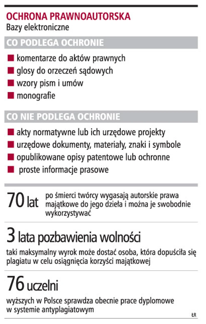 Na uczelniach trwa okres intensywnego pisania prac dyplomowych i magisterskich. Żaden ze studentów pretendujących do tytułu absolwenta wydziału prawa, administracji czy ekonomii nie mógłby jednak pochwalić się sukcesem, gdyby tworząc kolejne rozdziały pracy magisterskiej, nie korzystał z innych tekstów naukowych, komentarzy znanych prawników, aktów prawnych albo orzecznictwa sądów zgromadzonego w elektronicznych bazach wiedzy typu LEX Omega, Lex Polonica, czy Legalis. Jakie reguły rządzą autorską ochroną elektronicznych baz danych oraz prac naukowych? Czy ze zbiorów orzecznictwa można korzystać w sposób nieograniczony i dowolny? Czy można je na przykład kopiować, jakie reguły rządzą ich cytowaniem? Na co dzień z tego rodzaju systemów korzystają przede wszystkim prawnicy zatrudnieni w kancelariach. Elektroniczne zbiory są także narzędziem pracy sędziów i prokuratorów, którzy przy wydawaniu decyzji procesowych posiłkują się orzecznictwem sądowym i stanowiskami doktryny. Są one również bardzo przydatne w dużych firmach i urzędach, które w załatwianiu codziennych spraw wykorzystują m.in. zawarte w nich wzory pism i umów. Każda z tych osób powinna jednak uważać, by korzystając z nich na co dzień, nie naruszać praw autorskich do zawartych w nich materiałów.