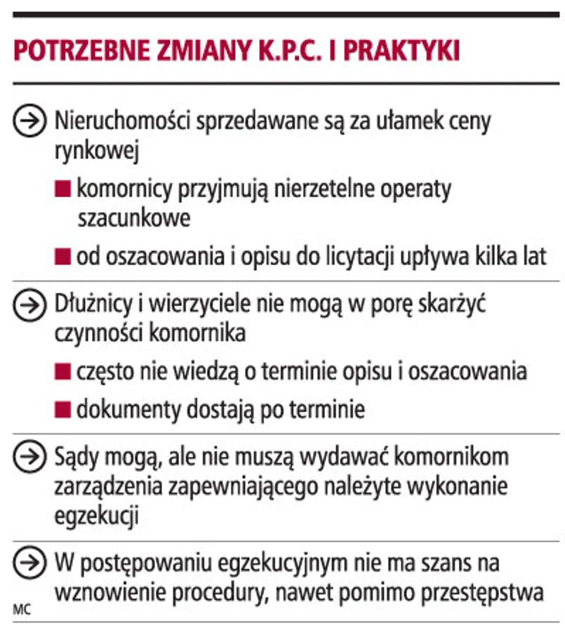 Dłużnicy i wierzyciele piszą skargi na czynności komornika, ale sądy przechodzą nad nimi do porządku dziennego. A przecież spoczywa na nich obowiązek szczególnej pieczy nad postępowaniem egzekucyjnym. I kiedy się ono skończy, kiedy osoba wtajemniczona nabędzie nieruchomość za ułamek jej wartości i zostanie wobec niej wydane prawomocne postanowienie o przysądzeniu własności, nikt nie może już tej decyzji wzruszyć. Dłużnikowi lub wierzycielowi pozostaje tylko dochodzenie odszkodowania solidarnie od winnych, czyli np. od biegłego, który poświadczył nieprawdę, od komornika sądowego, który źle wykonał swoje obowiązki, i od Skarbu Państwa za to, że sędzia nienależycie sprawował nadzór nad przebiegiem egzekucji. Dlatego konieczne jest wprowadzenie mechanizmów, które w razie wykrycia rażących nieprawidłowości w toku postępowania egzekucyjnego spowodują automatyczne wstrzymanie czynności.