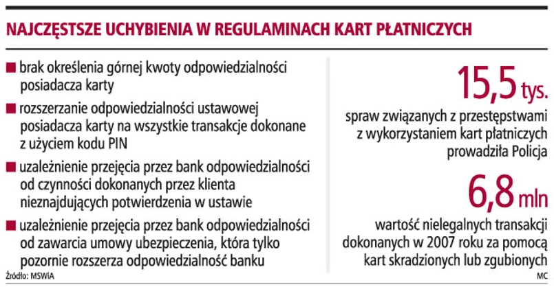 Dziesięć największych polskich banków wprowadza do umów przepisy ograniczające ustawowe uprawnienia posiadaczy kart płatniczych. Banki coraz częściej obciążają posiadaczy kart kosztami wszystkich transakcji dokonanych kartą przez osobę nieuprawnioną - wynika z raportu Urzędu Ochrony Konkurencji i Konsumentów. Tymczasem ustawa o elektronicznych instrumentach płatniczych (Dz.U. z 2002 r. nr 169, poz. 1385) stanowi, że posiadacza obciążają operacje dokonane z użyciem utraconej karty płatniczej tylko do czasu zgłoszenia wydawcy jej utraty. Ponadto prawo wyznacza górną granicę tej odpowiedzialności - jest to kwota stanowiąca równowartość w złotych 150 euro.