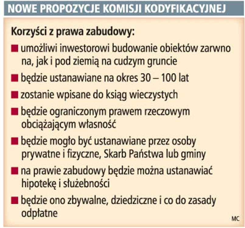 prawa uniwersalnego, to znaczy że będzie mogło być ustanawiane przez każdy podmiot, zarówno przez osoby fizyczne, jak i osoby prawne. Także Skarb Państwa lub gminy będą mogły ustanawiać prawo zabudowy. To zasadnicza różnica w porównaniu z użytkowaniem wieczystym, które może być ustanawiane tylko na gruntach Skarbu Państwa i samorządu – mówi prof. dr hab. Jerzy Pisuliński z Uniwersytetu Jagiellońskiego, współpracownik kancelarii Debenedetti Majewski Szcześniak, członek Komisji Kodyfikacyjnej Prawa Cywilnego.