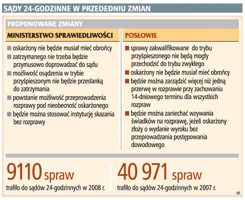 Nie jest konieczne, aby oskarżony w postępowaniu przyśpieszonym posiadał obrońcę. Sądy 24-godzinne powinny rozpoznawać tylko sprawy o charakterze chuligańskim. Sam tryb przyśpieszony nie będzie samoistną podstawą do zatrzymania sprawcy przez policję.