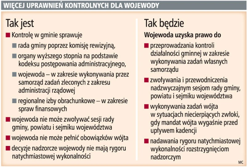 Gazeta Prawna dotarła do projektu zmian w ustawach samorządowych przygotowanych przez Ministerstwo Spraw Wewnętrznych i Administracji. Zgodnie z propozycjami wojewoda będzie mógł zwoływać i prowadzić nadzwyczajną sesję rady gminy, gdy dojdzie do wniosku, że istnieje potrzeba zasygnalizowania samorządowi powtarzających się nieprawidłowości w wykonywaniu zadań. Dodatkowo wojewoda będzie mógł przeprowadzać kontrolę działalności samorządu w zakresie wykonywania zadań własnych. Natomiast w przypadku wygaśnięcia mandatu wójta przed upływem kadencji, w przypadkach niecierpiących zwłoki, zadania i kompetencje wójta przejmie wojewoda lub osoba przez niego upoważniona.