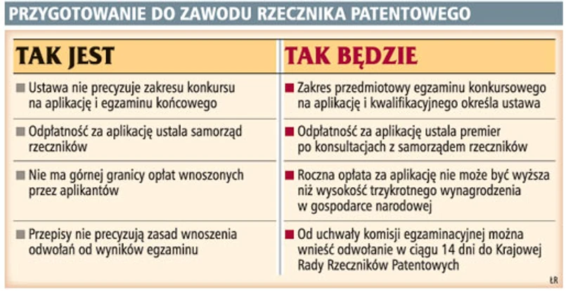 Jednak projekt przede wszystkim kreuje nowe zasady naboru i przebiegu aplikacji rzecznikowskiej. Jest to ważne, zwłaszcza w kontekście ostatnio rozpatrywanej przez Wojewódzki Sąd Administracyjny (sygn. akt VI SA/Wa 2223/08) skargi na uchwałę Krajowej Rady Rzeczników Patentowych odmawiającą skarżącej, która ubiegała się o przyjęcie na aplikację, wpisu na listę rzeczników. W wyroku WSA zdyskwalifikował zaskarżoną uchwałę za brak jakiegokolwiek uzasadnienia ocen na egzaminie. Pouczył, że uzasadnienie powinno zawierać podstawy punktacji za wiedzę kandydata na aplikację oraz wyjaśnienie zasad oceny pozostałych kryteriów. Zdaniem sądu Rada poruszała się jednak w granicach ustawy o rzecznikach, która stwierdza, że aplikantów wyłania się w drodze konkursu. Ustawodawca zatem wprost założył, że w przeciwieństwie do egzaminów na aplikacje prawnicze jest podczas konkursu miejsce na subiektywne oceny komisji, dodawał WSA.