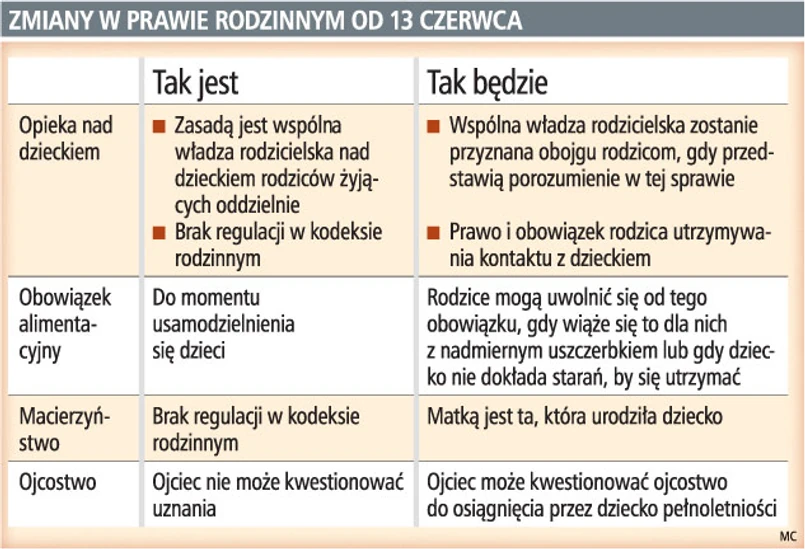 Nowelizacja kodeksu rodzinnego, która 13 czerwca wejdzie w życie, wprowadza w relacjach rodzinnych wiele istotnych zmian. Dotyczą one m.in. sprawowania władzy rodzicielskiej przez matkę i ojca niemieszkających razem oraz kontaktów dzieci z takimi rodzicami.