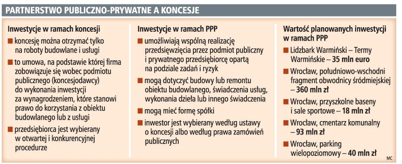 Są już pierwsze inwestycje realizowane na podstawie nowych przepisów o partnerstwie publiczno-prywatnym. Samorządy chętniej sięgają po koncesje na roboty budowlane niż po tradycyjne partnerstwo. Urzędnicy nauczyli się już procedur zamówień publicznych i dlatego wolą budowlane koncesje.